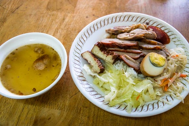 無招牌港式鴨莊便當 地址:高雄市前鎮區復興三路80號 電話: 07-3340780 營業時間:11:0014:00售完為止、週日公休 重點在這邊 *免費的酸菜鴨湯在結帳櫃檯的後面,滿滿配料千萬別錯過 *結帳櫃檯旁邊…