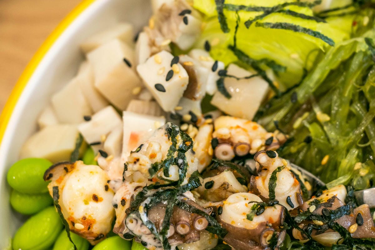 沙拉營養豐富又美味。室內空間提供插座,隔壁便是圖書館,